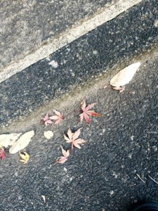樹の足元に積もった色鮮やかな落ち葉や風に飛ばされた落ち葉が彩る道も