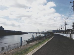 青い空を泳ぐ白い雲と気持ち良い風が吹いていた朝の川沿い