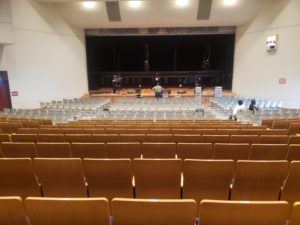 まだ静かなホール内、照明スタッフさん方により灯体が吊られ、音響スタッフさん方によりスピーカーが設置され