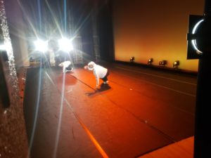 舞台のリノリウム敷きなどインストラクター皆で子供達の為の舞台づくり、会場づくり、楽屋の準備