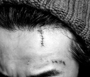 左額から右こめかみ下、耳の下まで切られホチキスで留められている状態、何ともグロテスクでフランケンシュタインのような痛々しい見た目