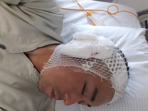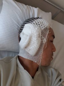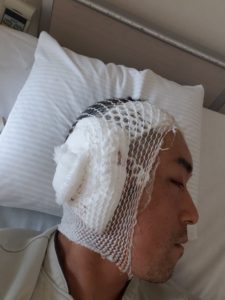 歩くのもままならない状態で自分で処置した傷のまま翌日脳神経外科の先生に伝えに行きそのまま形成へ伝えてもらい14針ほど縫い帰宅、手術前に自分で頭割ったアホタレでした