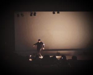 男子もまた袖に体育座りで舞台上を見つめる……
