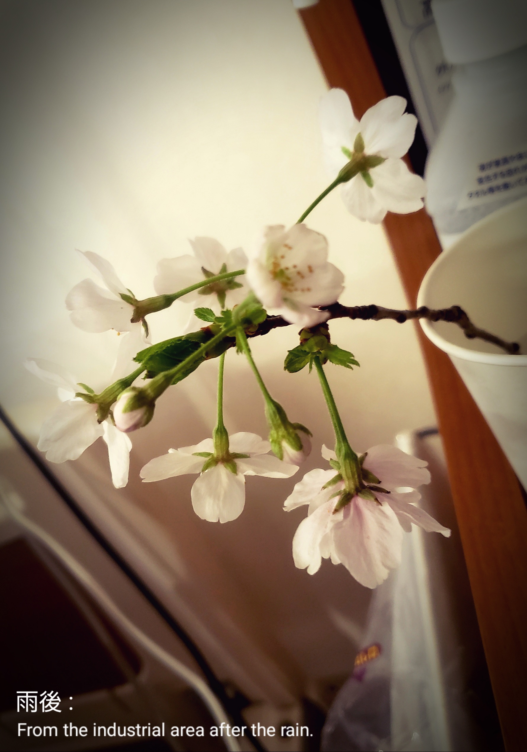 棚に置いた紙コップの中の桜はまだ芽だった蕾が小さな花を咲かせていました