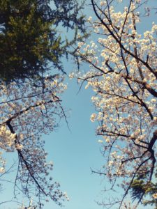 The moment I looked up at the cherry blossoms, which were still blooming beautifully, and felt the gentleness of the petals dancing in the wind.