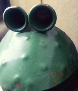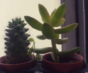 サボテンに水をあげ、玄関のPEACE君に見送られ