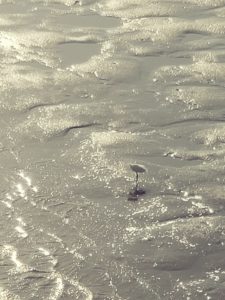 Gazing at the herons walking on the tidal flats where the driftwood stands out as the tide goes out.